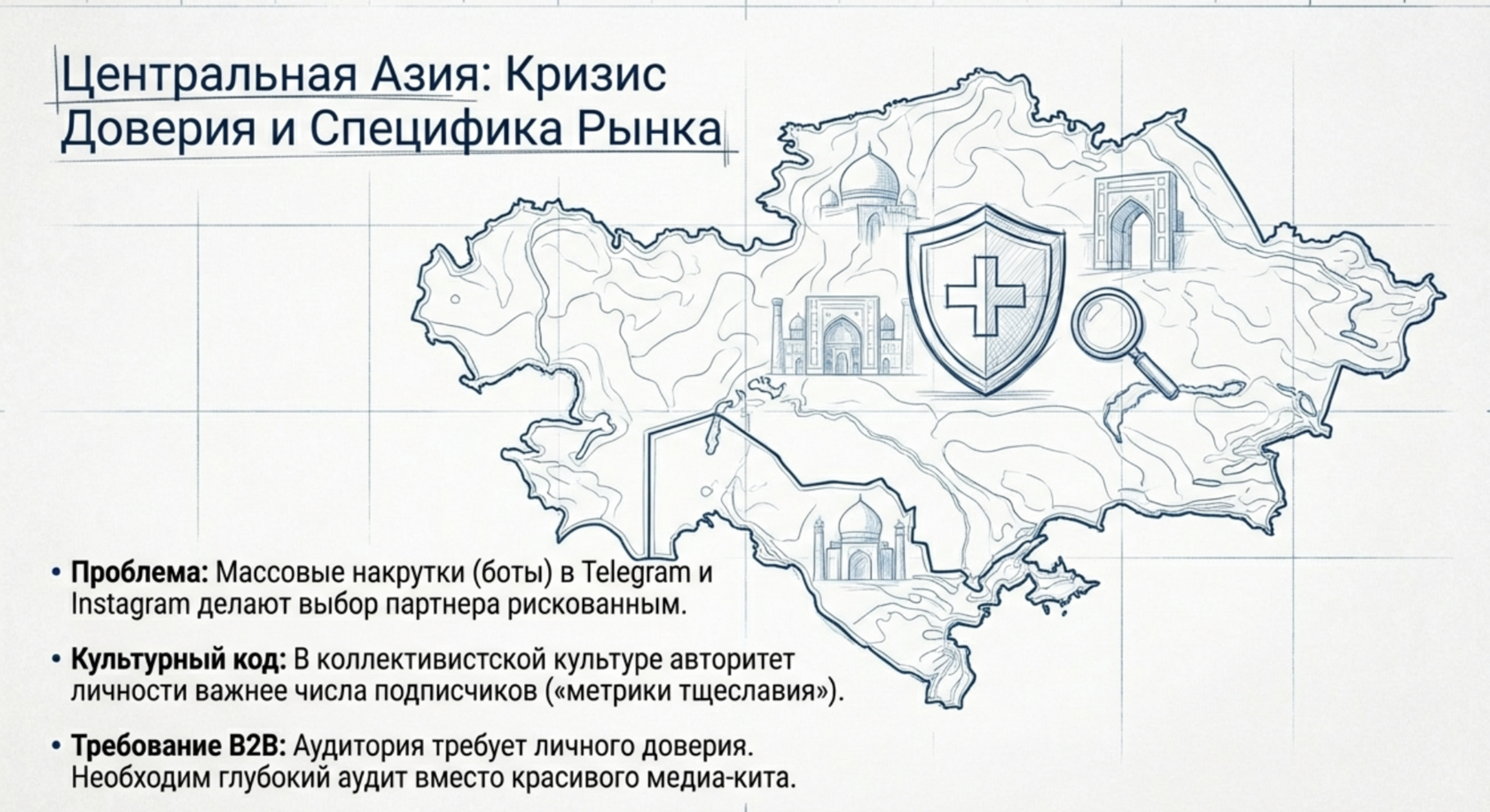 Рынок лидеров мнений в Узбекистане и Казахстане характеризуется высокой динамикой, но одновременно страдает от дефицита прозрачности. В сегменте взаимодействия бизнеса с бизнесом аудитория проявляет крайнюю осторожность к прямой рекламе, отдавая предпочтение личным рекомендациям и проверенному авторитету. Проблема накрутки показателей, таких как просмотры и количество подписчиков с помощью автоматизированных систем, остается острой в таких каналах, как Телеграм и Инстаграм. В таких условиях директору по маркетингу нужен эксперт, обладающий специфическими региональными компетенциями.